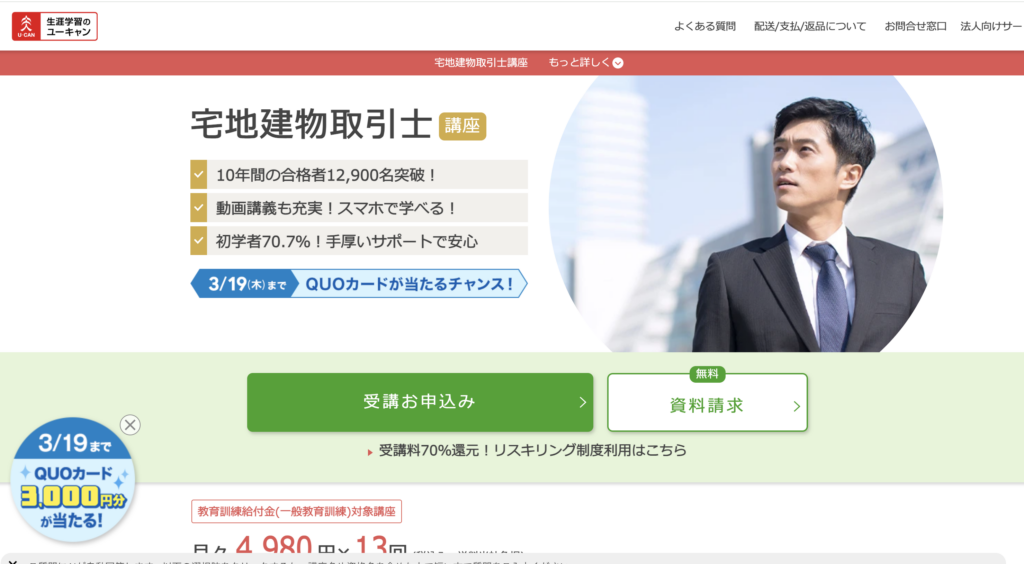 77.01%という合格率に加え、合格時の全額返金制度があるため、結果的に「最もお得に、確実に」合格できる可能性が高いといえます。5万円台の投資で合格すれば全額戻ってくるため、経済的なリスクも最小限です。
