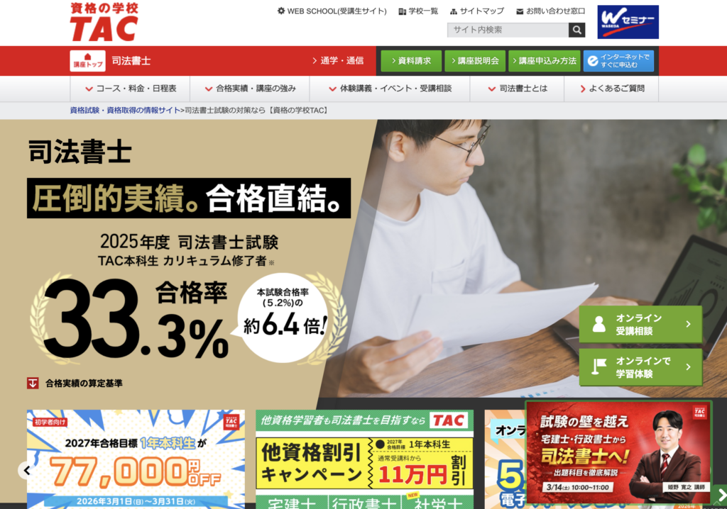 司法書士試験は11科目の広い範囲と記述式のハードルがあるため、多くの合格者が通信講座や予備校を利用しています。特に初学者の方は、プロが設計したカリキュラムに沿って進めるのが合理的な選択肢でしょう。